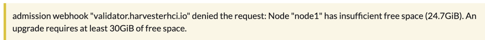 Harvester will check the amount of free system partition space on each node when you select Upgrade. If any node does not meet the requirement, the upgrade will be denied as follows