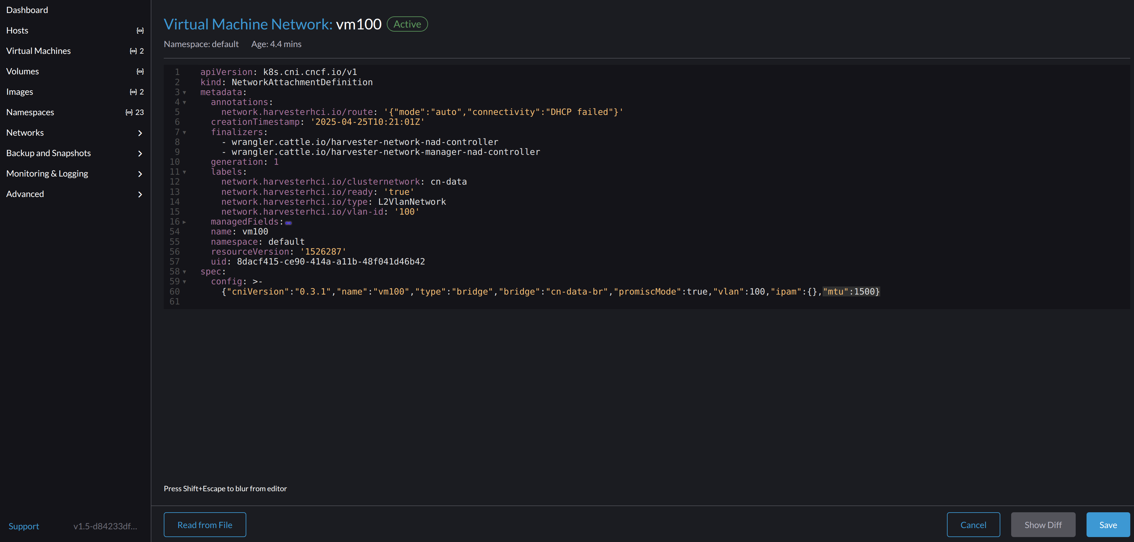 You can check this using the VM network and any secondary networks you may have used. Harvester does not allow you to change the MTU when any of the connected virtual machines are still running.