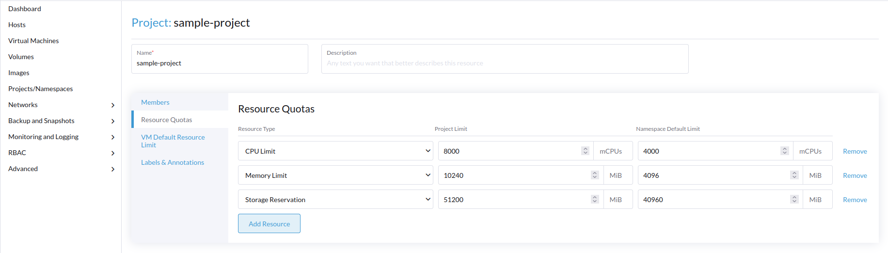 - Specify the desired project Name. Next, go to the Resource Quotas tab and select the Add Resource option. Within the Resource Type field, select either CPU Limit or Memory Limit and define the Project Limit and Namespace Default Limit values.