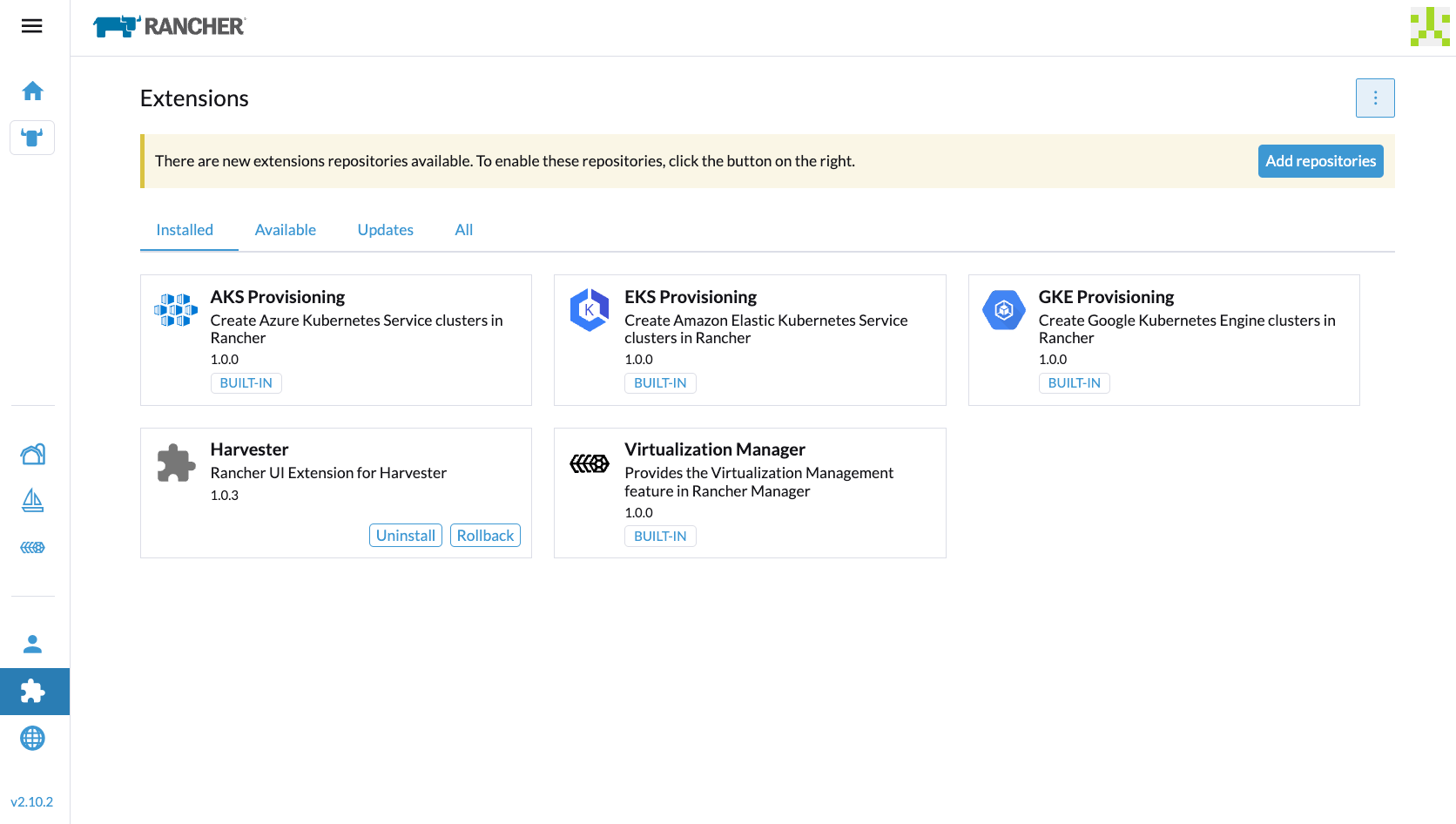On the Rancher UI, go to Extensions, and then select ⋮ > Manage Extension Catalogs.