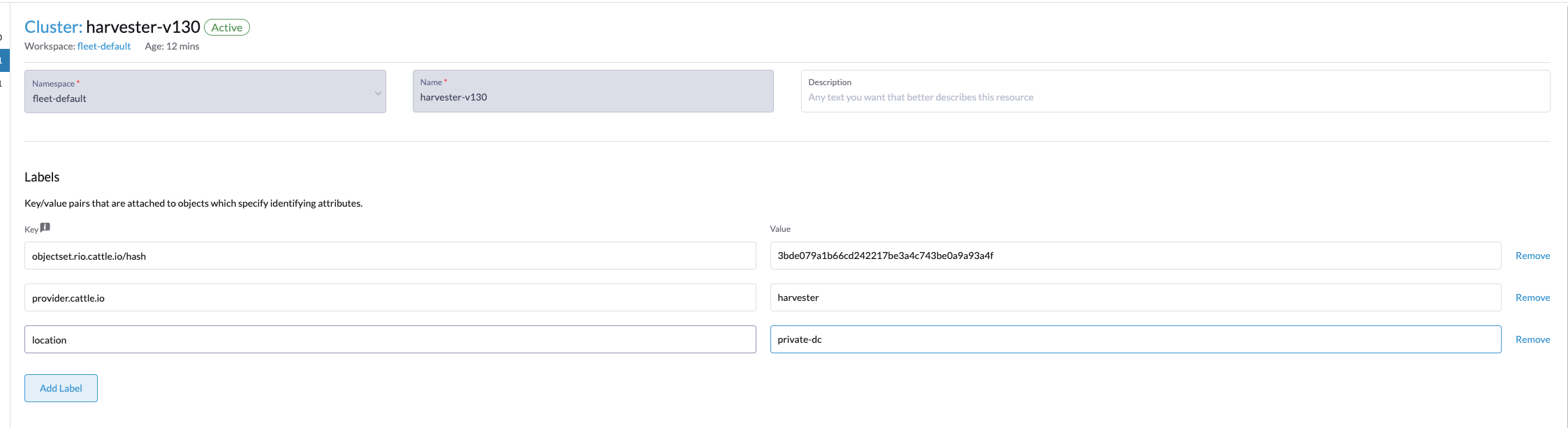 - (Optional) On the Clusters tab, edit the Fleet cluster config to add labels that can be used to group Harvester clusters.