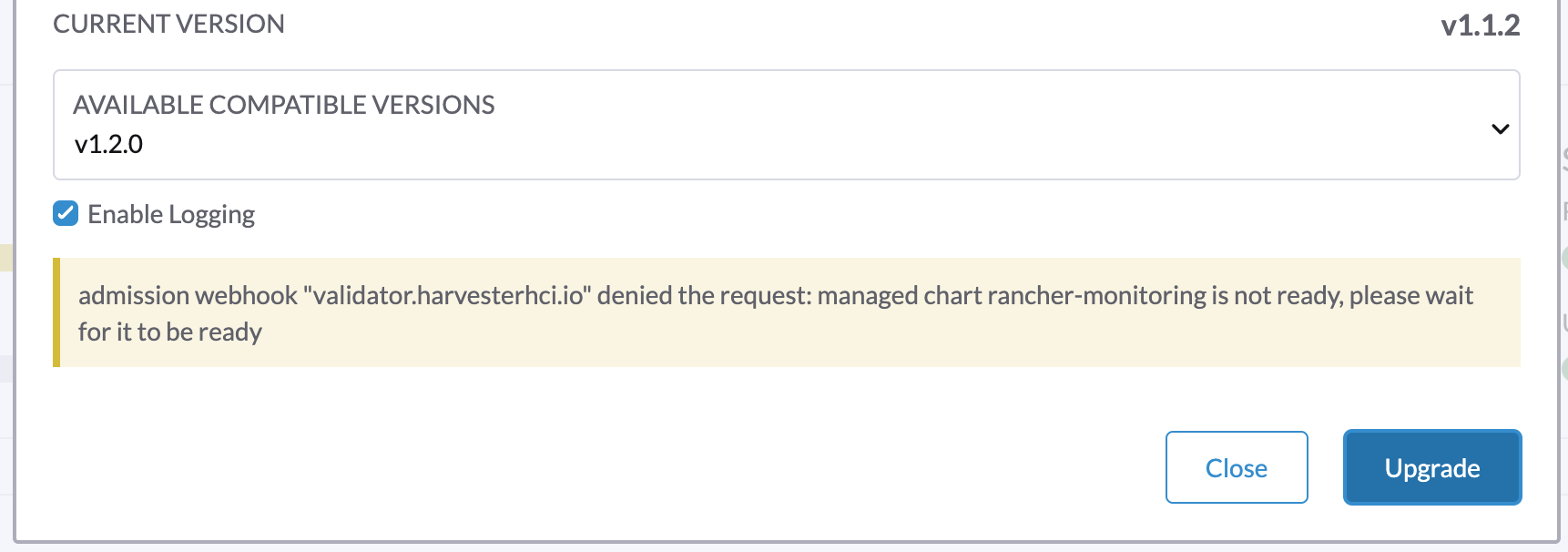1. An upgrade can't start and reports "validator.harvesterhci.io" denied the request: managed chart rancher-monitoring is not ready, please wait for it to be ready