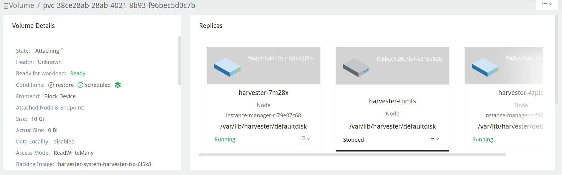 3. Check the upgrade repository VM volume. It should be attached to a pod called virt-launcher-upgrade-repo-hvst-<upgrade-name>. If one of the volume's replicas stays in Stopped (gray color), the cluster is running into the issue.