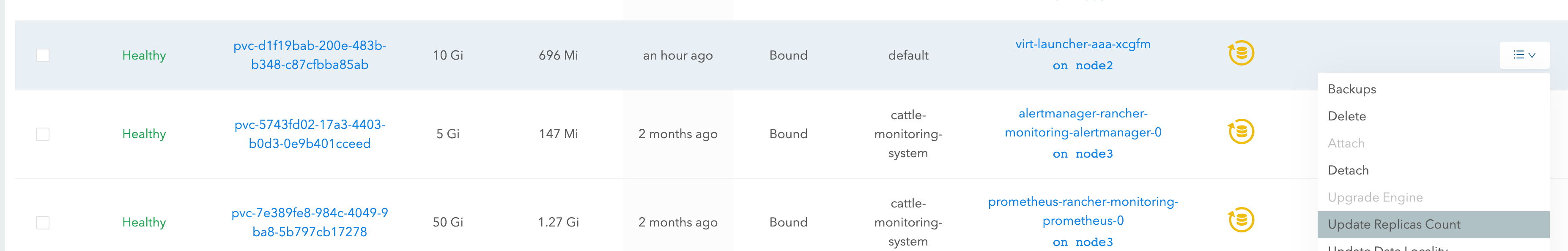 3. Locate the problematic volume and click the icon on the right side, then select Update Replicas Count: